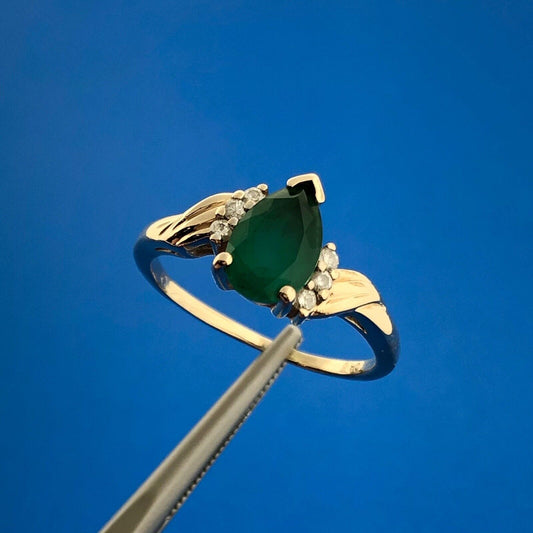 Vintage 14K Yellow Gold Pear Emerald Diamond Accented May Anniversary Ring