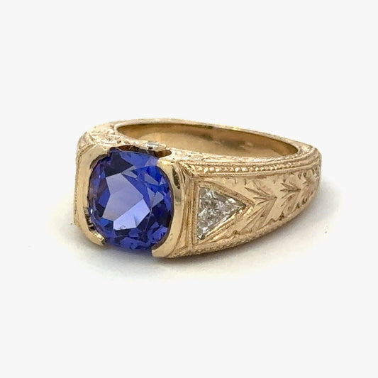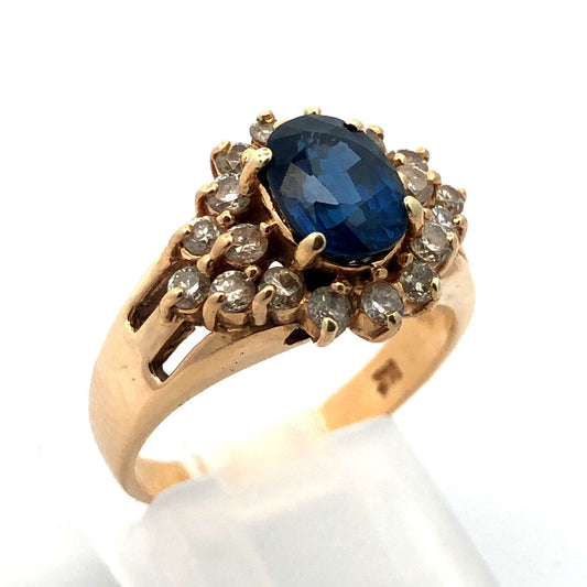 Vintage 14K Yellow Gold Oval Blue Sapphire Round Diamond Halo Anniversary Ring