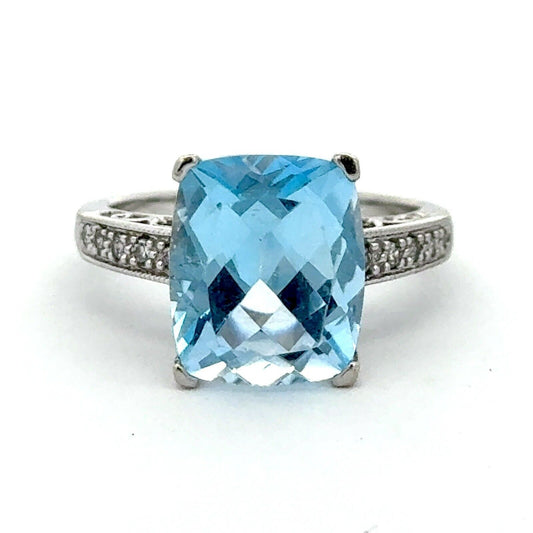 Designer 14K White Gold Radiant Cushion Cut Blue Topaz Diamond Accented Ring