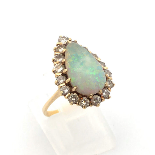 Vintage 14K Yellow Gold Pear Opal Cabochon Diamond Halo Cocktail Ring