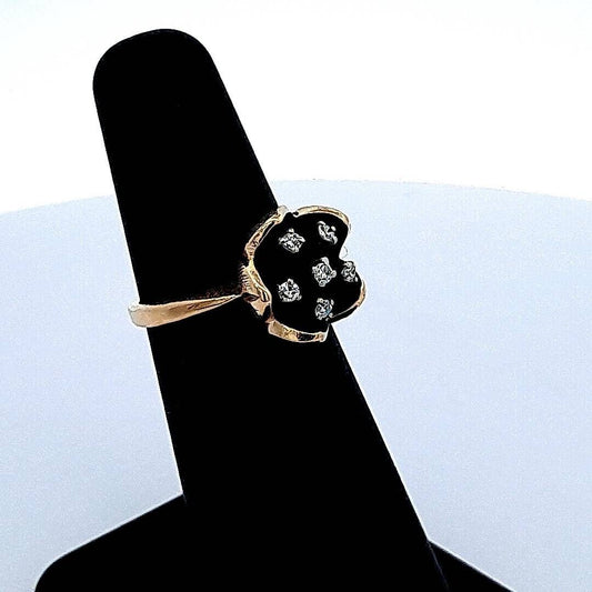 Art Deco Style Estate 14K Yellow Gold Diamond Black Enamel Flower Floral Ring
