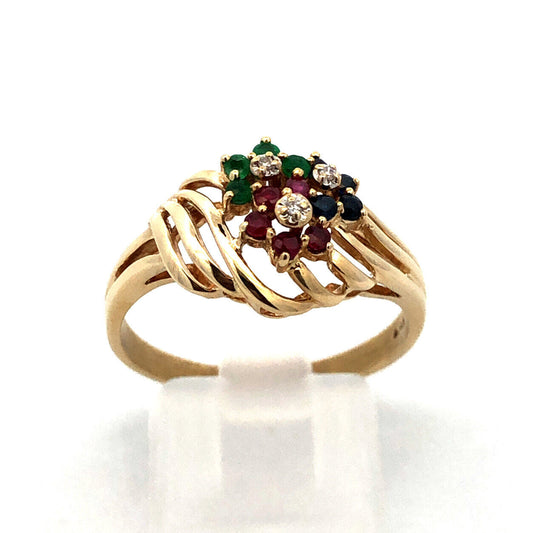 Designer 14K Yellow Gold Sapphire Ruby Emerald Diamond Flower Modernist Ring