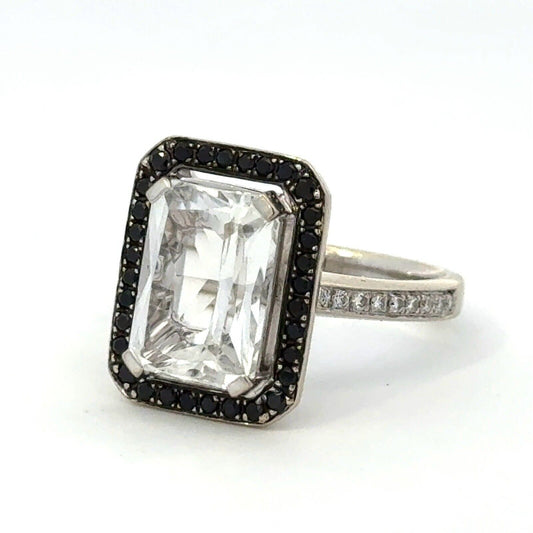 Designer 18K White Gold Emerald Cut White Topaz Black White Diamond Accent Ring