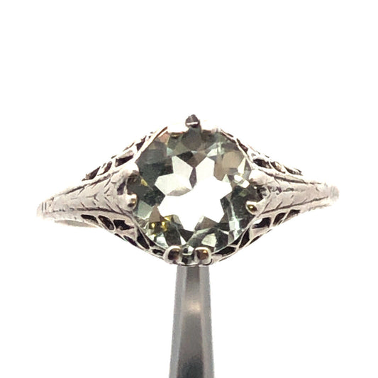 Vintage 14K White Gold Green Amethyst Prasiolite Solitaire Filigree Detail Ring