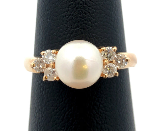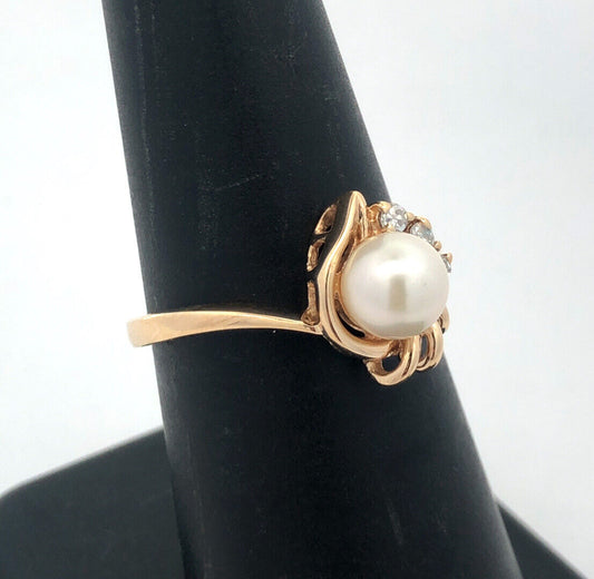 Designer 14K Yellow Gold Pearl Solitaire Round Diamond Accent Cocktail Ring