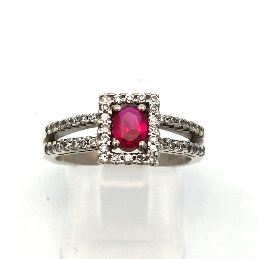 14K White Gold Lab Created Oval Ruby Round Pave Diamond Halo Ring