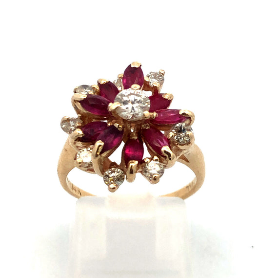 Vintage 14K Yellow Gold Round Diamond Marquise Lab Created Ruby Cocktail Ring