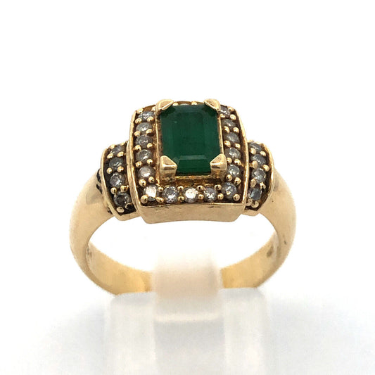 Vintage 14K Yellow Gold Emerald Diamond Halo Statement Cocktail Ring