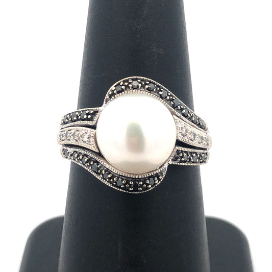 Designer JH 10K White Gold Round Pearl Black White Diamonds Statement Ring