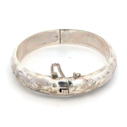 Vintage Longcraft 925 Sterling Silver Floral Scroll Etched Hinged Cuff Bracelet