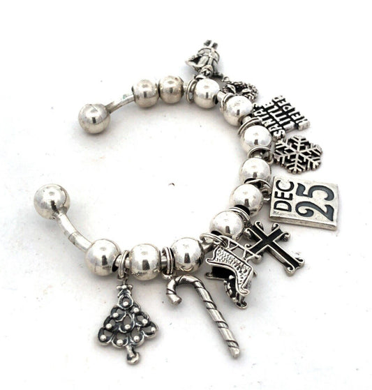 Vintage SJC 925 Sterling Silver Christmas Holiday Theme Beaded Charm Bracelet