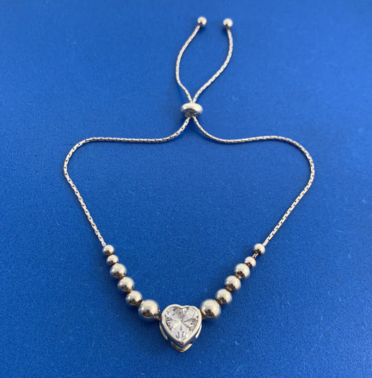 Cubic Zirconia Heart Charm 925 Sterling Silver Beaded Adjustable Bracelet