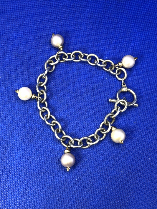 Estate 925 Sterling Silver 14K Gold Accented Pearl Charm Toggle Bracelet