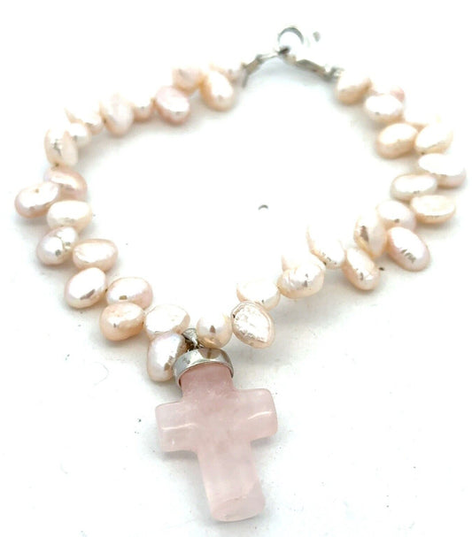 Estate 925 Sterling Silver Pink Rose Quartz Cross Charm Pearl Beaded Bracelet