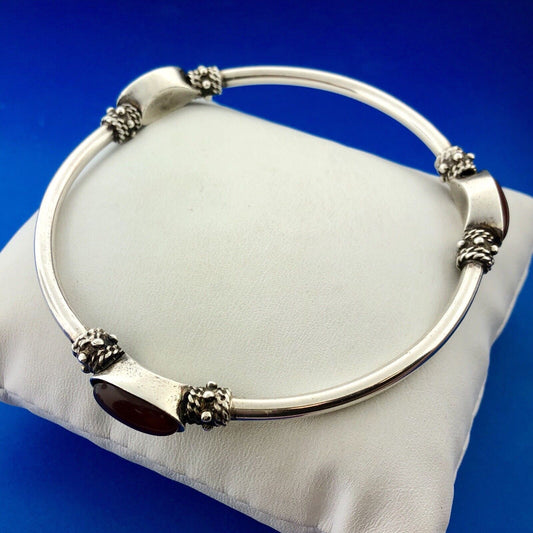 Vintage Designer FAS 925 Sterling Silver Carnelian Station Bead Bangle Bracelet