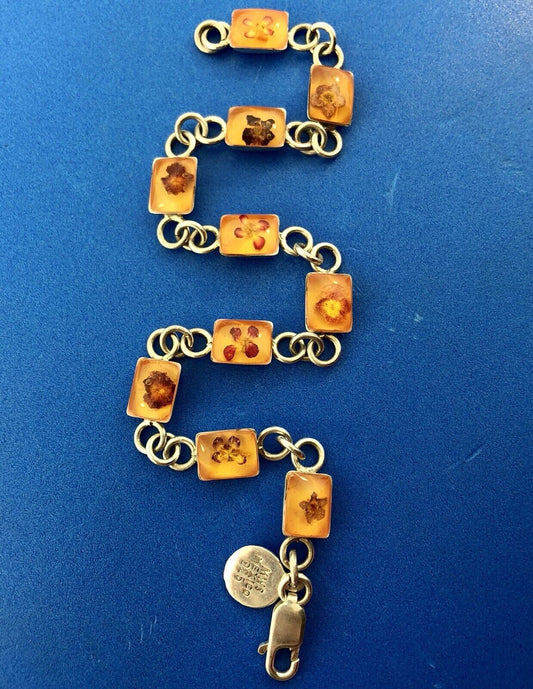 Vintage MWS Taxco Sterling Silver 925 Amber Encased Flower Bud Panel Bracelet