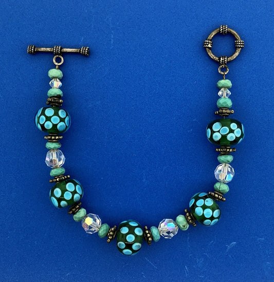 Vintage 925 Sterling Silver Turquoise Art Glass Crystal Bead Toggle Bracelet