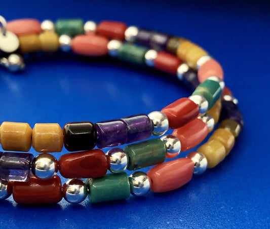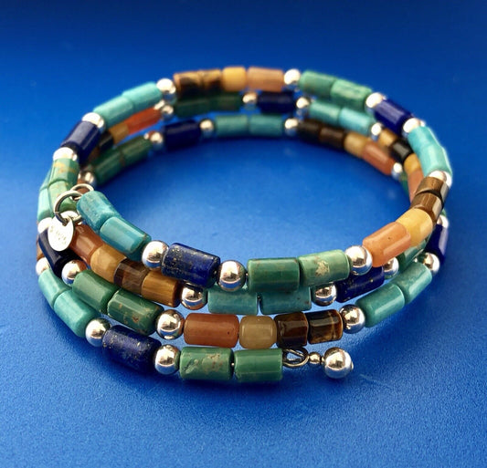 Sterling Silver Turquoise Lapis Lazuli Tigers Eye Bead Three Wrap Flex Bracelet