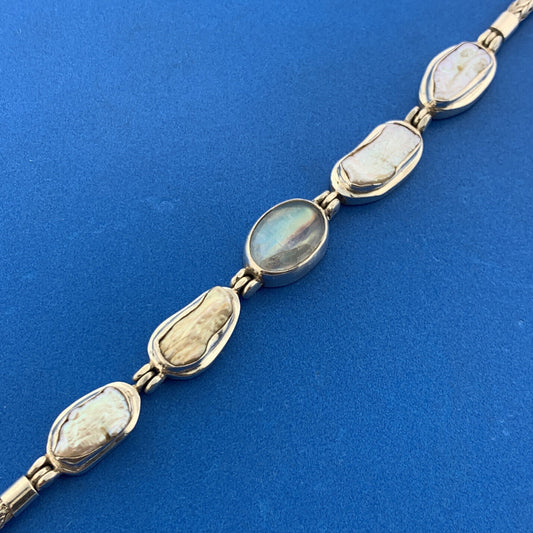 Vintage 925 Sterling Silver Moonstone Mabe Pearl Panel Statement Bracelet