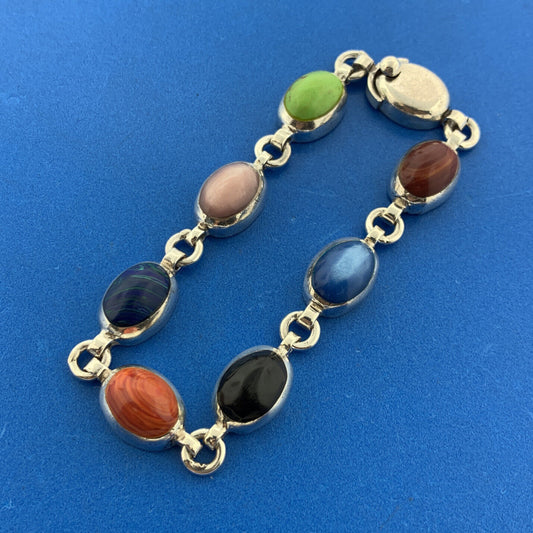 Vintage Mexico Sterling Silver Mixed Gemstone Oval Cabochon Statement Bracelet