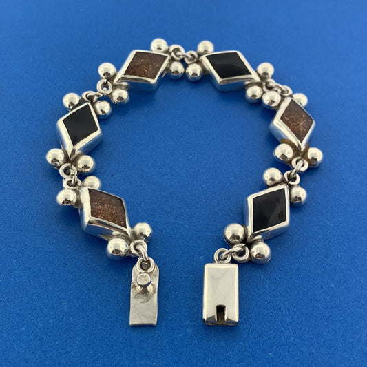 Vintage Taxco TH-40 925 Sterling Silver Black Onyx Goldstone Link Panel Bracelet