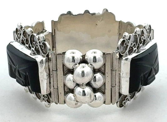 CBR Taxco Mexico 925 Sterling Silver Carved Black Onyx Statement Panel Bracelet