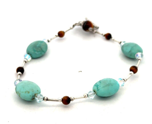 Estate 925 Sterling Silver Turquoise Tigers Eye Crystal Beaded Toggle Bracelet