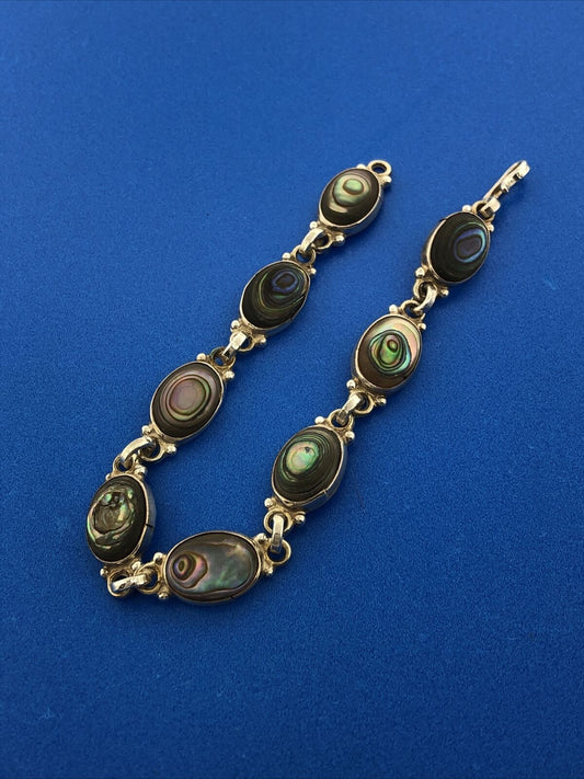 Vintage Taxco Mexico 925 Sterling Silver Abalone Oval Panel Link Bracelet