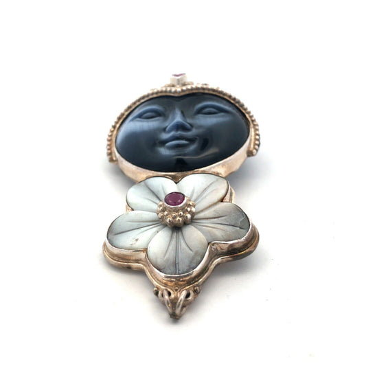 Designer Sajen 925 Sterling Silver Blue Cat's Eye Ruby Goddess Brooch Pendant