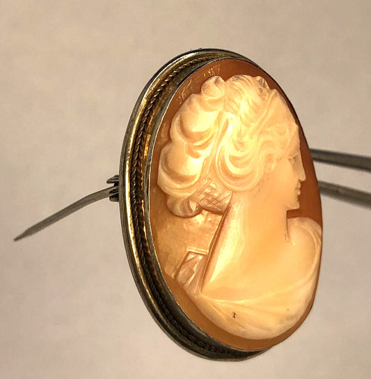 Victorian 800 Fine Silver Carved Woman Cameo Oval Pin Brooch Pendant