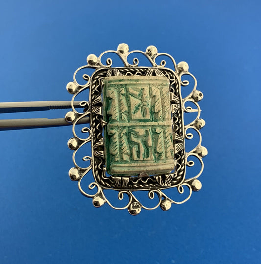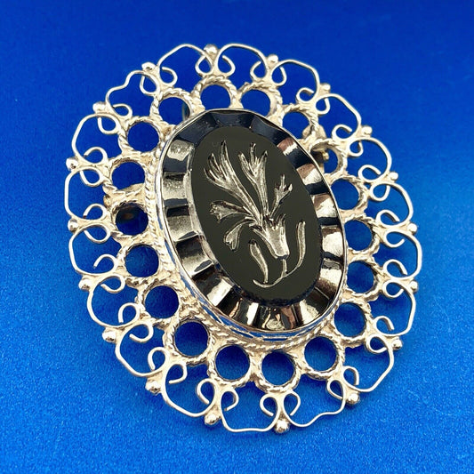 Plata De Jalisco Mexico Sterling Silver Black Intaglio Glass Pin Brooch Pendant