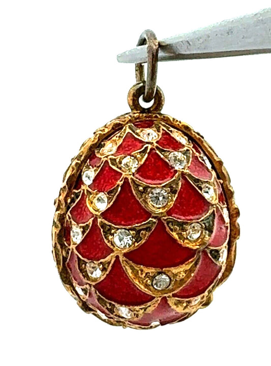 Vintage 925 Sterling Silver Gold Vermeil CZ Red Enamel Faberge Egg Pendant