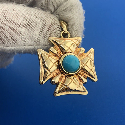 Designer Italy Sterling Silver Vermeil Gold Tone Turquoise Maltese Cross Pendant