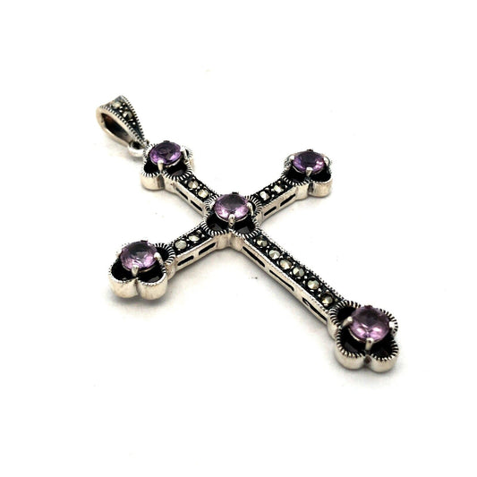 Vintage 925 Sterling Silver Round Amethyst Marcasite Statement Cross Pendant