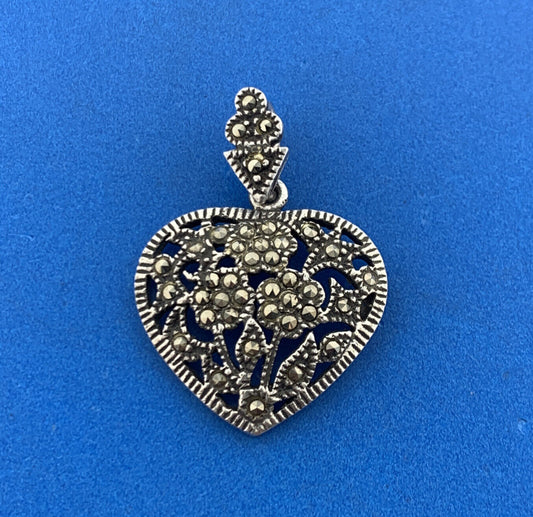Vintage 925 Sterling Silver Marcasite Scroll Open Work Heart Pendant