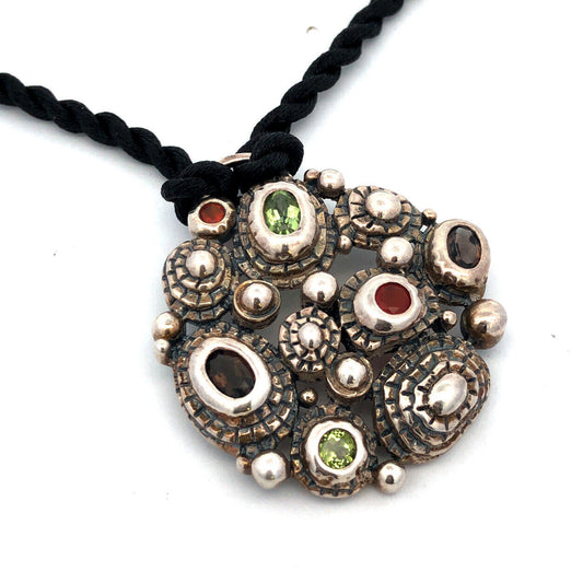 Vintage J 925 Sterling Silver Multi Gemstone Textured Pendant Silk Necklace