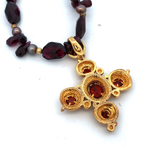 Vintage 925 Sterling Silver Gold Vermeil Amethyst Beaded Garnet Cross Necklace