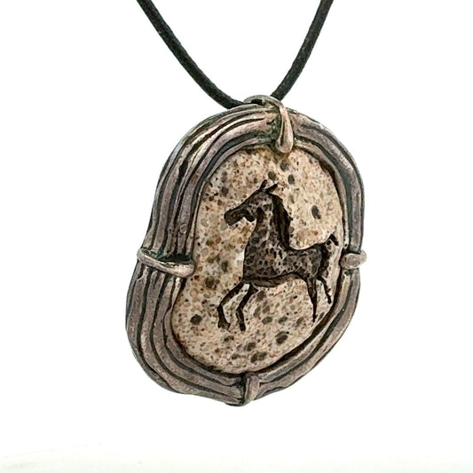 Vintage Sterling Silver Stone Carved Horse Statement Pendant Leather Necklace
