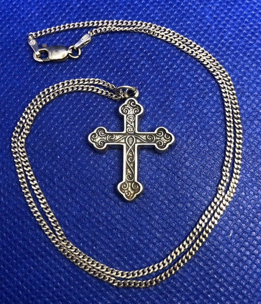 Designer P. Lux 925 Sterling Silver Scroll Detail Cross Pendant & Chain Necklace
