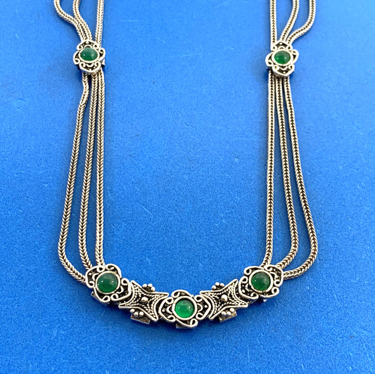 Vintage 925 Sterling Silver Triple Strand Wheat Chain Green Tourmaline Necklace