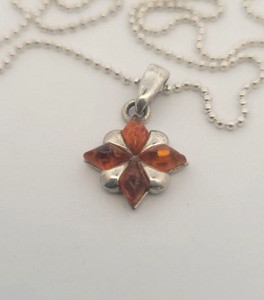Designer Vintage 925 Sterling Silver Amber Cabochon Flower Pendant Necklace