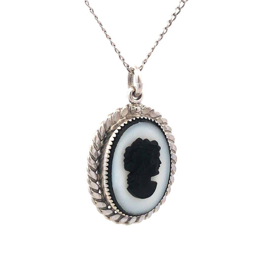 925 Sterling Silver Black White Oval Cameo Pendant Chain Necklace
