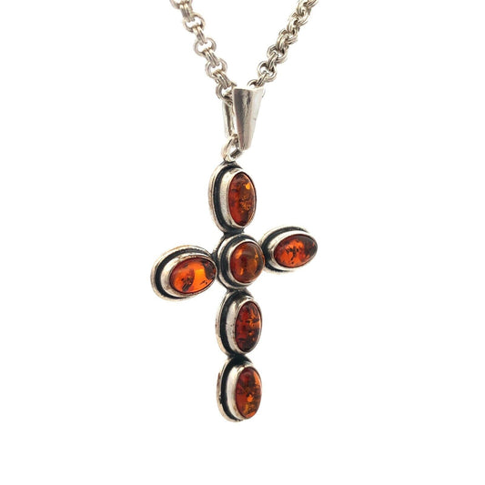 925 Sterling Silver Designer Vior Italy Oval Amber Cross Pendant Chain Necklace