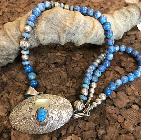 Vintage Native American Sterling Silver 925 Lapis Lazuli Bead Concho Necklace