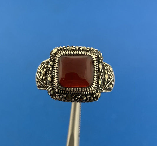 Designer 925 Sterling Silver Red Carnelian Marcasite Square Dome Ring
