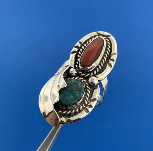 Vintage Native American 925 Sterling Silver Turquoise Coral Squash Blossom Ring