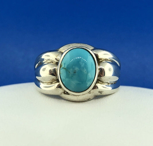 Designer OIM Sterling Silver 925 Oval Turquoise Modernist Ribbed Design Ring
