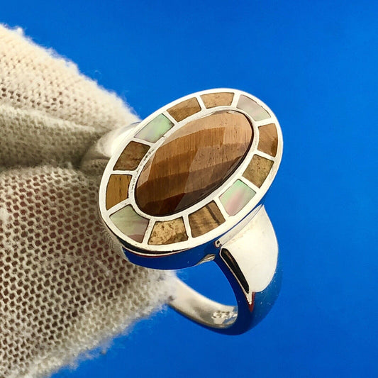 Vintage 925 Sterling Silver Oval Enamel Mosaic Jasper Inlay Statement Ring