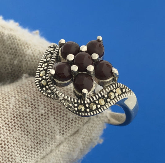 Vintage Sterling Silver 925 Marcasite Agate Flower Art Deco Style Ring