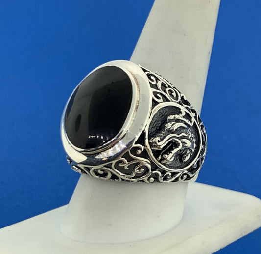 Stunning Sterling Silver 925 Oval Cabochon Onyx Openwork Dragon Ring Size 10